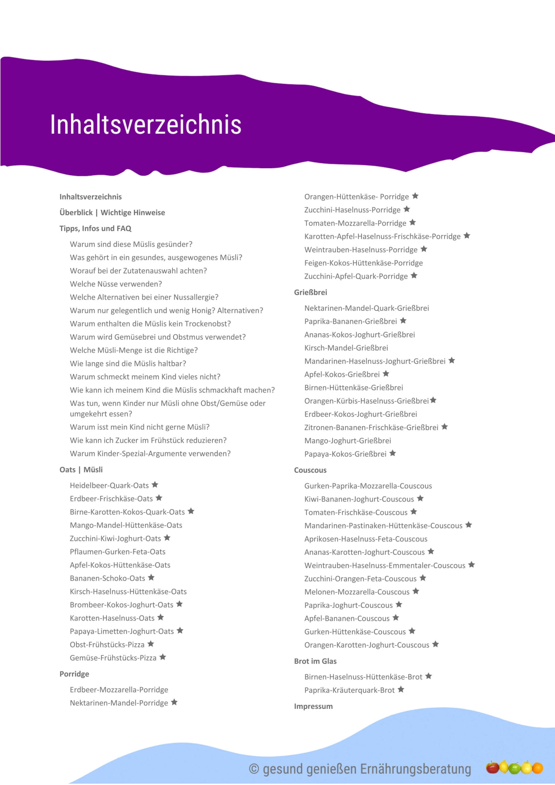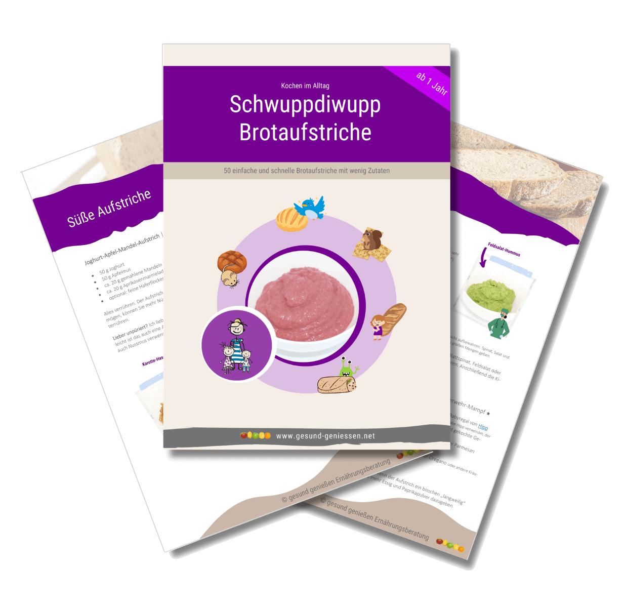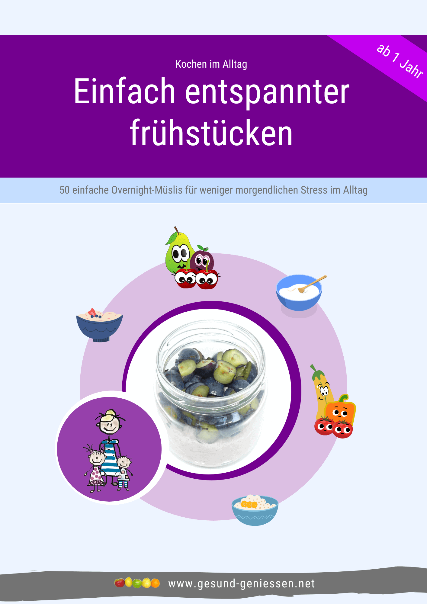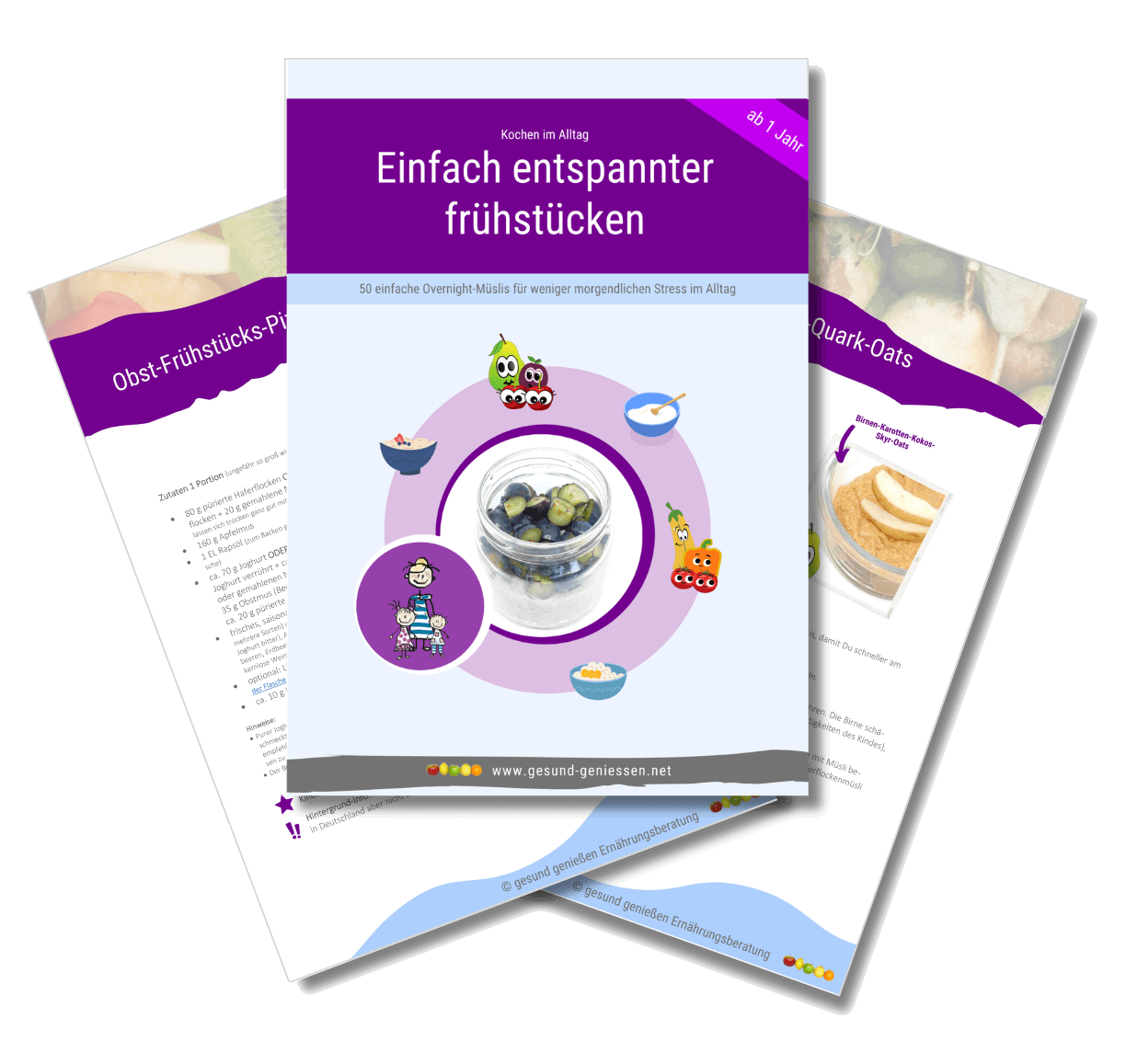Ein eBook enthält 50 gesunde Müsli-Rezepte (Overnight-Rezepte, die ganz oder teilweise am Vortag zubereitet werden können) und ein weiteres 50 gesunde Schwuppdiwupp-Brotaufstriche. Bei so viel Auswahl finden Sie bestimmt ein paar Rezepte, die Sie dann immer wieder wiederholen können. Müsli muss dabei nicht süß sein, man kann es auch mit Couscous, Brotstücken, Frischkäse, Mozzarella, Scheibenkäse in Kombination mit Obst und Gemüse als deftige Variante zubereiten.