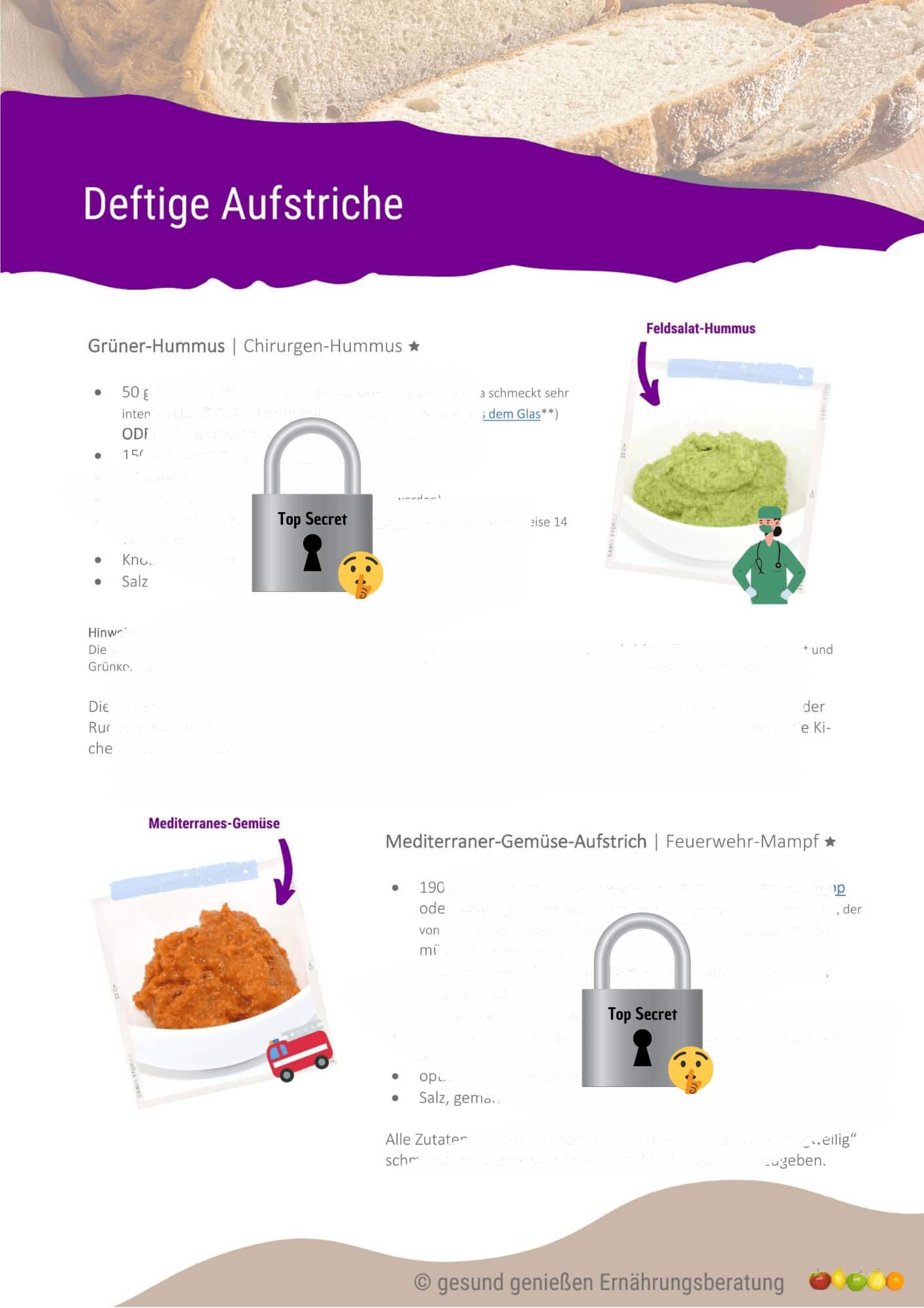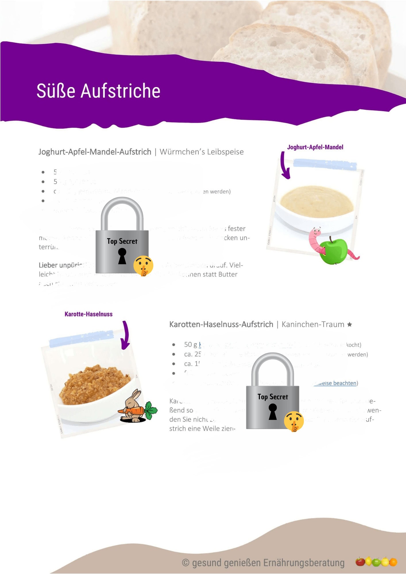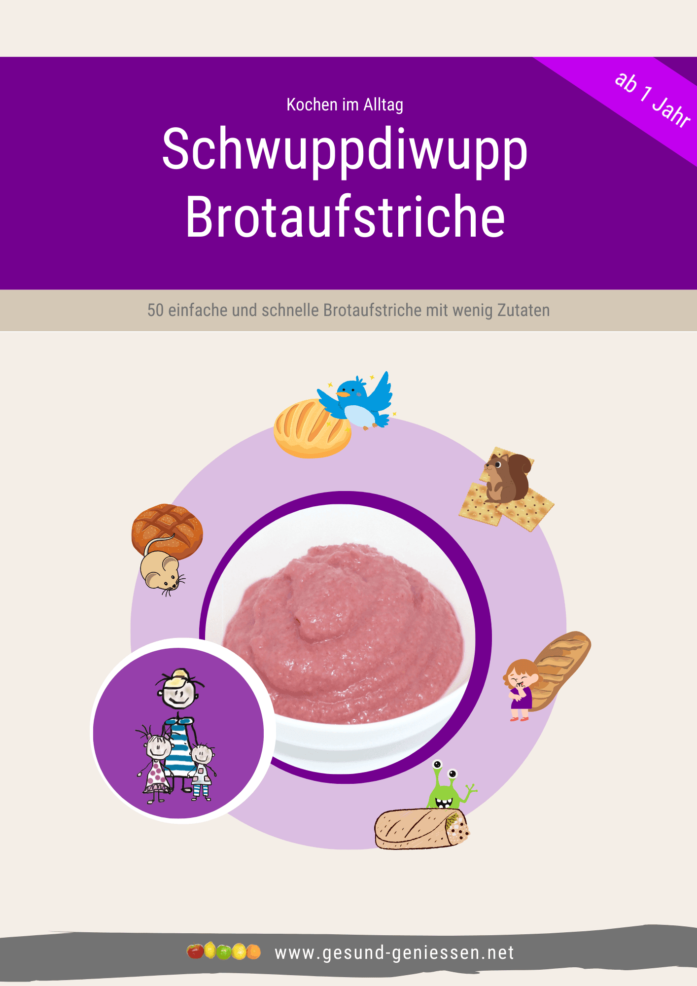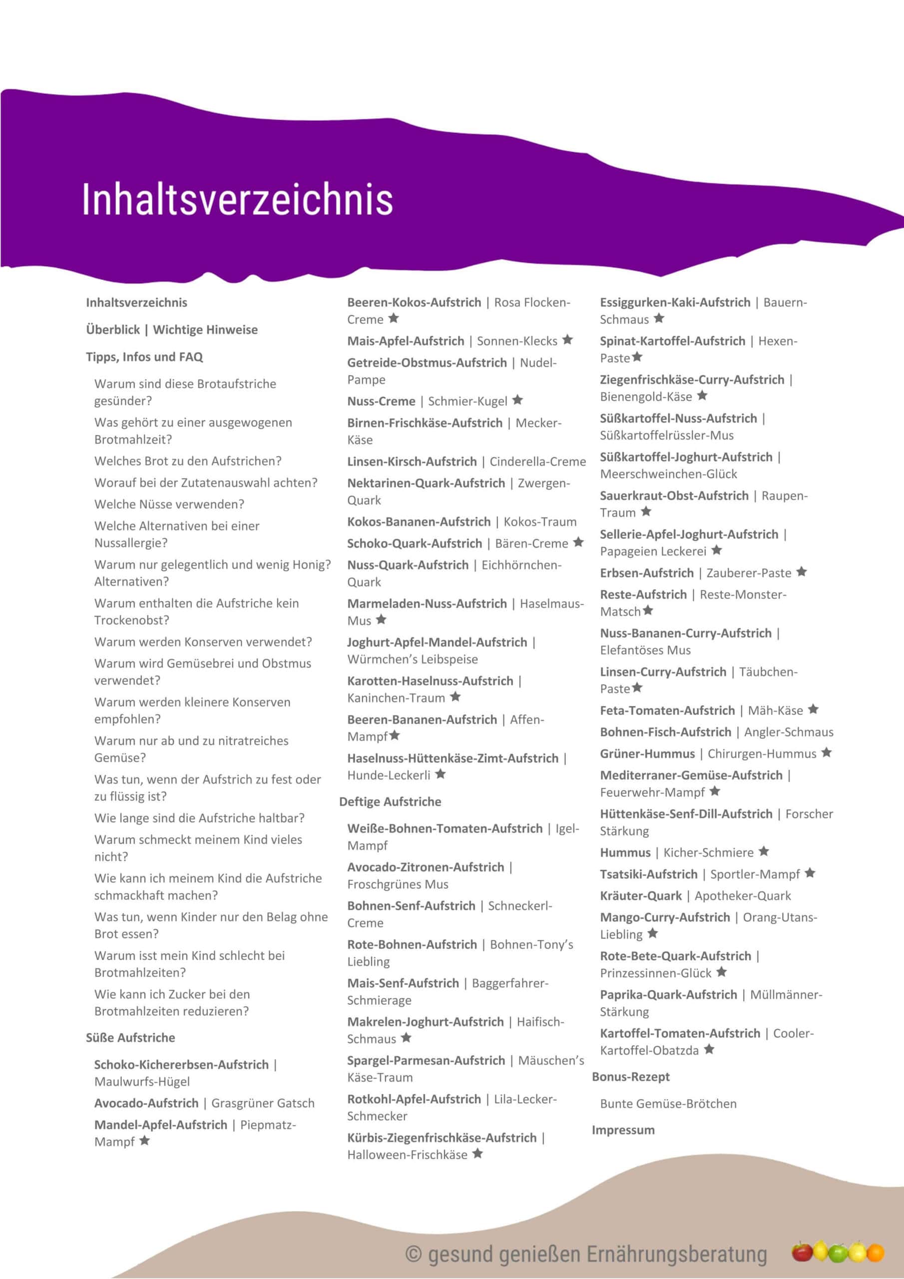 Ein eBook enthält 50 gesunde Müsli-Rezepte (Overnight-Rezepte, die ganz oder teilweise am Vortag zubereitet werden können) und ein weiteres 50 gesunde Schwuppdiwupp-Brotaufstriche. Bei so viel Auswahl finden Sie bestimmt ein paar Rezepte, die Sie dann immer wieder wiederholen können. Müsli muss dabei nicht süß sein, man kann es auch mit Couscous, Brotstücken, Frischkäse, Mozzarella, Scheibenkäse in Kombination mit Obst und Gemüse als deftige Variante zubereiten.