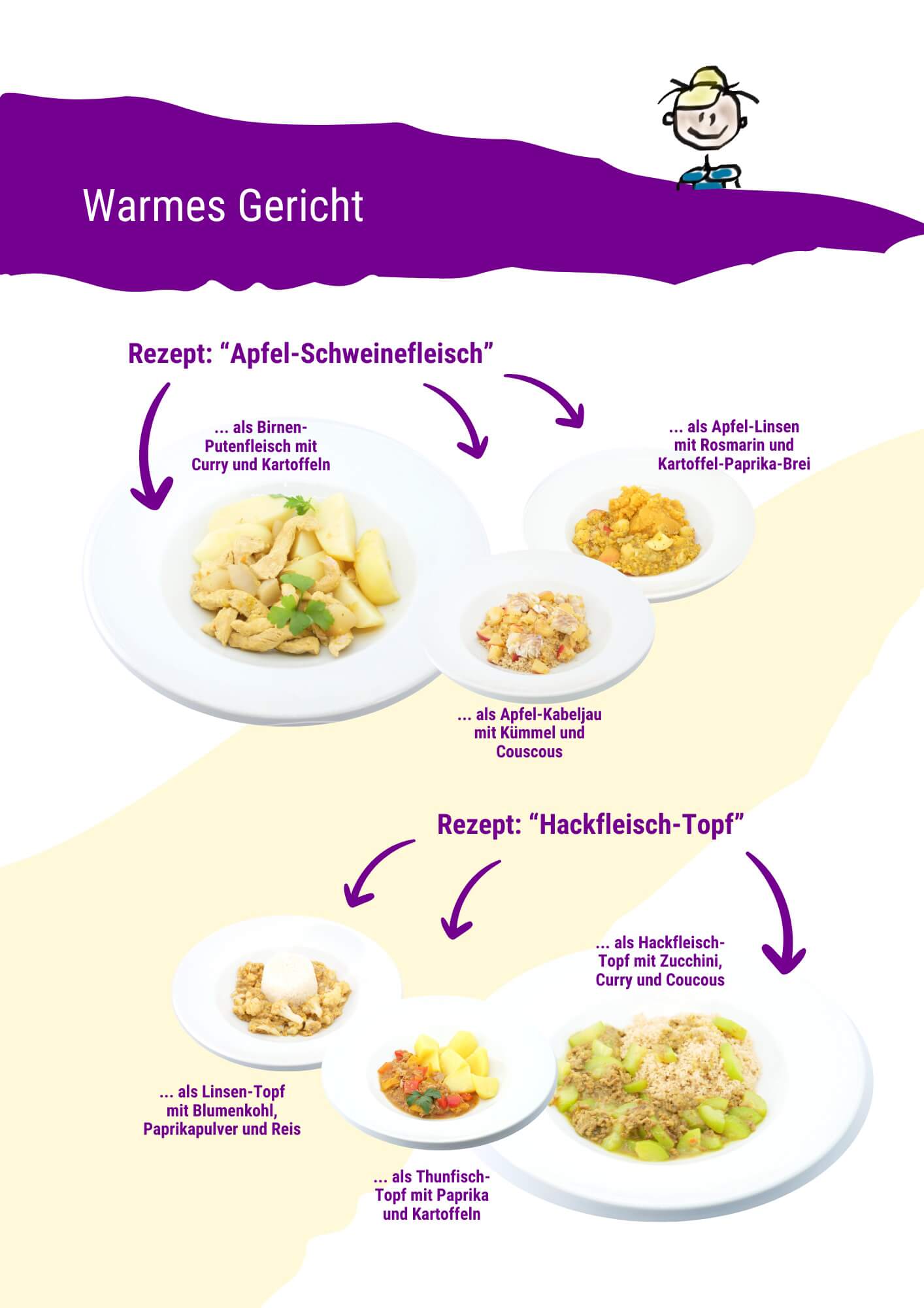 Das gilt nicht nur für die warme, sondern auch für alle anderen Mahlzeiten. Ein Rezept für jede dieser Mahlzeiten, bei dem Sie einfach die Zutaten austauschen, würde reichen.
